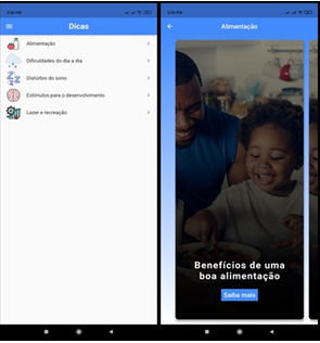 In the tips tab, the user can find information regarding Food, Difficulties of everyday life, Sleep disturbance, Stimuli for development and tips for Leisure and recreation. For each item, the user can have access to themes related to these general themes, as shown in Figure 4. It is necessary that family members have quality information on how to deal with the child daily so that the child is given the best possible care. The use of a mobile health application is capable of generating improvements in clinical care, as well as in the promotion of care for those patients; in the view of nursing, an application is effective so that the patient and caregivers acquire knowledge and feel safe in the continuity of treatment in their homes.16