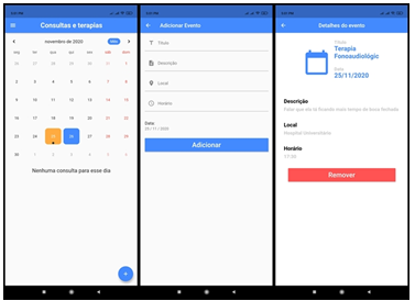 The MicroNews application also provides a function for monitoring therapies in consultation, with annotation in the calendar so that the user can organize the information about the place, time and activity that will be performed, so that there is greater organizational control over the treatment schedule medical activities that the child has; as can best be seen through Figure 5.