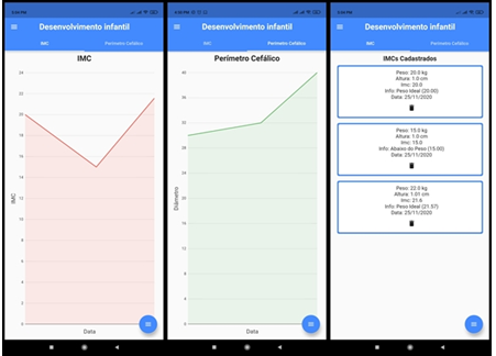 One aspect that concerns parents is child development based on their weight and head circumference; in this way, the Child Development tab provides the option for the user to enter data concerning the child's weight and height and the application automatically calculates to inform whether the child is at the ideal weight, below or above the ideal. It also has the option for users to note the diameter of the head circumference organized according to the measurement date. Both functions can be seen in the form of a list as well as in the form of graphs, as can be better seen in Figure 7.