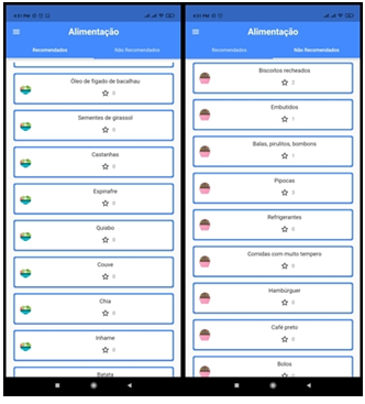 The application also provides the user with an exclusive tab for feeding, with a varied list of recommended and non-recommended foods for infant feeding, so that the responsible person can have a source of research at the time of the child's food planning, as well as make a monitoring of the best accepted foods, since it is possible to alternate between the two lists and favor the food that the child accepts in the diet. Figure 8 illustrates what has just been said.