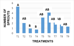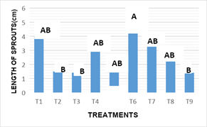 The length of sprouts: Figure 4 The results obtained with respect to the variable length of new sprouts obtained in vitro after 16 weeks of incubation. Statistical analysis showed that there are significant differences between the effects of treatments on the variable length of outbreaks (-0.003). In treatment 6, (4.88 cm) the longest length of sprouts was observed. The results in the statistical analysis showed no differences with those obtained in the treatments T1, T4, T5, T7 and T8. This response statistically exceded treatments 2, 3 and 9, (1.5, 1.40, and 1.04 cm respectively). The length of the sprouts observed in treatment 6 (100 %+6.0 mg MS-1KIN+2.0 mgL-1 AIA), is due to the high concentration of cytokinins in the culture medium, this results coincides with Jankiewicz8 reported where it also stands out as a joint form that the presence of auxins stimulates do elongation and cell division.