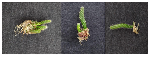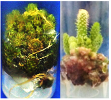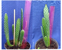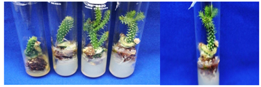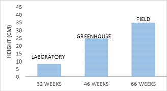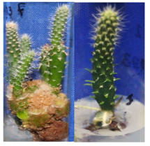 Acclimatization: Nopal plantlets obtained in vitro and rooted were transferred to greenhouse conditions to be acclimatized and basically plant survival rates were assessed. Figure 9 shows the growth of plants during acclimatization in the greenhouse and field. The nopal plants obtained in vitro conditions for acclimatization, were placed in a peat moss substrate and without additional nutrients, showing100% survival. This stage of plant acclimatization was also reported by Bhau10 obtaining the same stage survival of Coryphantha elephantidens Lem plants (Figure 10). We can observe the acclimatization and development of plants in the greenhouse.