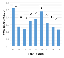 Stem diameter: Figure 5 the statistical analysis performed showed that there are no significant differences between the effects inducing treatments on the variable diameter of stems (-0.032). The results obtained in the culture medium used, and the combination of growth regulators as well as their respective doses in all treatments, showed no significant statistical difference between treatments for the variable diameter of the stem.