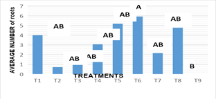 Number of roots: Figure 6, the statistical analysis of the results revealed significant differences between treatments according to regulatory combinations and doses used on the root number variable (-0.004). For this variable, the stems were subculture in vitro, in different treatments and combinations of growth regulators and in treatment 6 was presented on average 5.92 roots, standing out as the best response for the greatest number of roots obtained, surpassing the results obtained in treatment 9, who showed no response when not presenting roots. For this variable under study, it was notable that in most treatments they had root development, so the analysis of statistics and their variance did not detect significant differences between them and are shown as statistically equal with treatment 6. In the results obtained it was found that the combination KIN:AIA, was the presenting a better response towards the stimulation of a greater number of roots,, and where the presence of auxins was highlighted, since independent of concentrations, it promotes the generation of roots in subcultured stems in vitro. Rosa showed, that the rooting of Turbinicarpus rioverdensis, T. schmiedickeanus subsp. gracilis and T. isabelae (species belonging to the family cactaceae), was performed in an efficient manner with the presence of auxins. Garcia reported that the maximum development of roots was added to the culture media indolbutyric acid (AIB). However, other results reported by Escobar, indicate that some concentrations and types of auxins induced the formation of callus in the basal part of the shoots cultivated in vitro conditions.