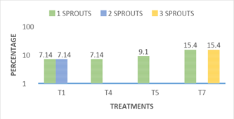 Bifurcation of stems: Figure 7 shows the incidence of stems with bifurcation in the different treatments. The bifurcation of stems obtained in vitro is an important variable, since for each fork allows us to have a new sprouts, to be grown in vitro, highlighting treatment7, in which 15.4% of the stems presented up to three new sprouts (shoots) per cultivated stem, in most treatments they had 30.8% of new shoots through the bifurcation. Treatment 1, showed 7.14 % in bifurcation by one stem cultivated and 7.14 % with two new sproutss, giving a total of 14.28 % response of new shoots through the bifurcations presented on the stems. Treatments 4 and 5 showed only a news sprouts of 7.14% and 9.1% respectively (Figure 8). The rest of the treatments showed no significant difference between treatments and this variable of new shoots through the bifurcation of the stems grown in vitro. The response to the emission of new shoots by cultivated stem, observed in treatment 7, was basically stimulated by the presence of type cytokinin’s and concentration in the culture medium, this response was also reported by Jankiewicz8 who reported that in many explants grown in vitro usually the addition of cytokines promote the sprouting of axillary buds, and stimulate the expansion of leaves in addition to retardation.9