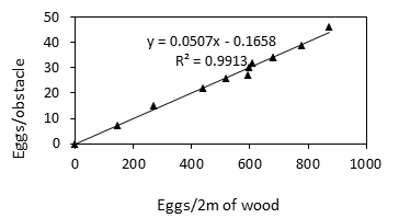 Drop observed in average number of eggs can be explained by cold and lower temperatures.19 To this natural factor, is added the effect due to predators several species (Coccinellidae, Phytoseiidae, Miridae…) feed on the spider mite eggs.20–22 Females of Phytoseiidae destroy a proportion of winter eggs before starting of diapause and contribute to the regulation of the P. ulmi population.23 In our study, Typhlodromus (Typhlodromus) setubali consumes between 10 to 20% of winter eggs, result of four seasons of biological control against the red mites by this phytoseiid in the apple orchard. The results obtained by using empirical method and the method proposed by the International Organization for Biological Control are similar. Although the procedures are different, the result is based on the number of obstacles that can contain 2 meters of wood. The relationship between the mean number of eggs per obstacle and total count of eggs per 2m of wood, is properly linear with a significant correlation between the two calculations (r2= 0.99) (Figure 3). For example, the averages of 35 and 22.28 eggs per obstacle obtained using counting method correspond respectively to 700 and 400 eggs per 2m/wood in the IOBC method.