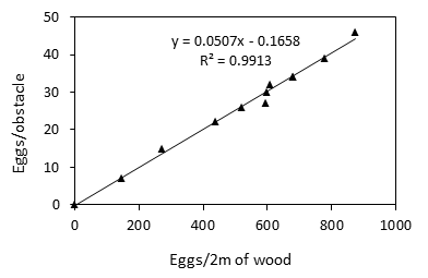 In order to characterize the distribution of eggs on wood, Taylor's law is used.6 This law relates the variance (s2) to the mean density of eggs (m) according to the following relation: s^2=〖am〗^b, a and b are intercept and regression slope, respectively. Both parameters were expressed under a logarithmic scale log(s^2)=log(a)+blog(m).7 Slope provides information about the distribution: when b=1, the species is distributed randomly, when b>1, the distribution is aggregative and regular when b<1.To establish such a relationship and calculate the b value, the mean density and variance of each row were calculated (and transformed into log) and a Student test was applied using software R.