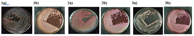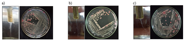 Figure 1 Isolation of bacterial pathogen on TZC agar medium. a) TVkP-1 isolate; b) PPtP isolate; c) PElB isolate.