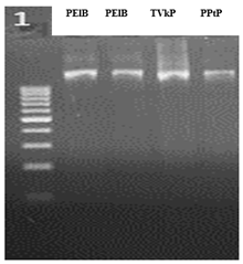 Figure 5 Gel band image of three bacterial isolates with 16S rRNA. 1st and 2nd lane PElB isolate, 3rd lane TVkP-1 isolate and 4th lane PPtP isolate.