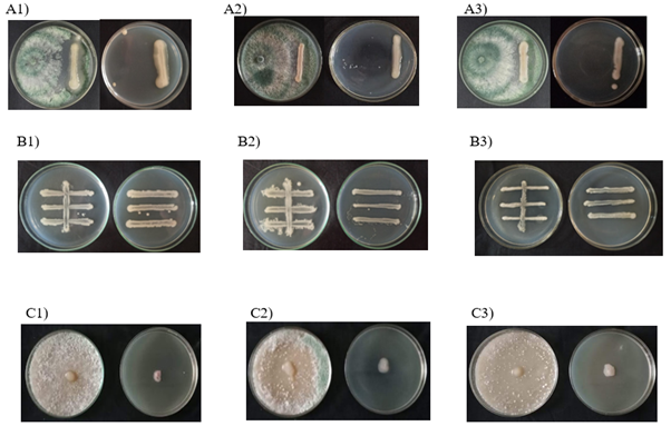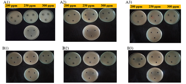 Figure 6 In vitro evaluation of antibacterial antibiotics against bacterial pathogen, Streptocycline (A1-A3) and Bronopol (B1-B3) 1) TVkP-1 isolate; 2) PPtP isolate; 3) PElB isolate.