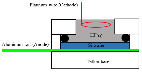 Figure 3 depicts a typical electrochemical etching process for porous silicon achieved by crystalline silicon wafer with aqueous hydrofluoric acid (HF) connected to potentiostat. Generally, a solution of 48% aqueous HF: ethanol (3:1) is usually taken to fabricate pSi samples, where, in order to reduce the formation of bubble and improve the infiltration of etchant, ethanol is often added for increasing the wettability. The pore formation relevant to the silicon etching is addressed by Shcherban et al.,89