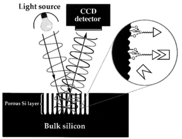 The results express that in the refractive index of the porous silicon matrix, the alteration (induced by the binding of analytes) can be easily detected by the charge-coupled device (CCD), as the peak shift of the effective optical thickness in the reflectance spectrum, as shown in Figure 5.90–95