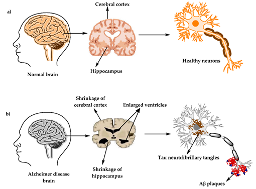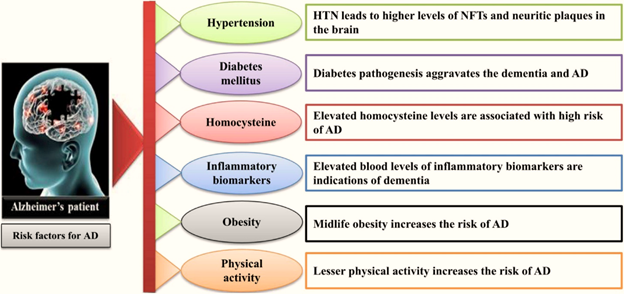 AD can be defined as the loss of cognitive function, memory, and behavioural functions. It usually occurs in people of age 65 or older.4 There is no proper treatment available for AD, but certain therapies are used to alleviate the symptoms. Clinical symptoms of AD vary depending upon the degree of illness. AD has been categorized into three stages depending upon the extent of cognitive decline: pre-symptomatic, moderate, and dementia. The primary and most common symptom of AD is short-term memory loss, which is followed by impaired abilities including thought, reasoning, decreased motivation, and impaired executive functioning. Several biological and environmental risk factors are associated with the development of AD.4 Among the biological risk factors, trisomy 21 may be a reason for the early onset of AD. The APO E (Apo lipoprotein E) allele contributes to AD by increasing the formation of amyloid plaques. Other risk factors include aging, depression, smoking, cerebrovascular diseases, head injury, and increased levels of homocysteine (Figure 2).5