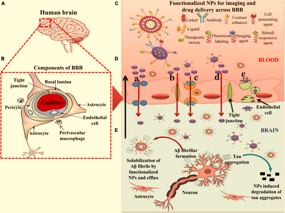 The human Central Nervous System (CNS) is a complicated system differentiated by two distinct barriers, known as the cerebrospinal fluid barrier (CSFB) and the blood-brain barrier (BBB).11 The blood-brain barrier is critical in the pathophysiology of Alzheimer's disease. Cerebrovascular malfunction in Alzheimer's disease causes cognitive decline and dementia, which can progress to brain amyloid angiopathy. It also plays a role in the deposition of Aβ peptides in CNS. The blood-brain barrier regulates Aβ transit to the brain through two major receptors: 1) LRP1 (low-density lipoprotein receptor related protein 1) RAGE (receptor for advanced glycation end products) is a receptor for advanced glycation end products. Poor Aβ peptide elimination due to LRP1/RAGE receptor dysregulation may result in Aβ accumulation, resulting in a weakened blood-brain barrier and neuronal damage.12