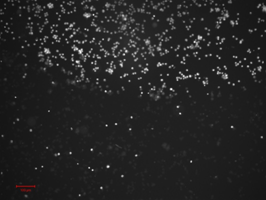 The photodynamic effect of the conjugate proposed is depicted in Figure 3. Based on propidium iodide fluorescence, the difference of cells state is shown in irradiated (upper part of Figure 3) and non-irradiated areas of nanoconjugate treated cells suspension. As it can be seen, the irradiation has led to massive cases of cell death proving enhanced photosensitizing activity of the nanoconjugate.