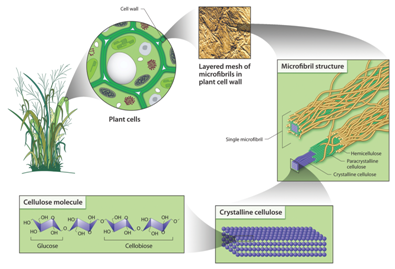 Lignocellulosic biomass represents one of the few resources that can facilitate sustainable production of substantial amount of biofuels. It contains three major constituents: cellulose, hemicellulose and lignin. Elementary fibril primarily cellulose containing ~36 β-D-glucan chains coated with other polysaccharides to form micro fibrils (Figure 1). Each micro fibril might contain up to 40 cellulose chains and is about ~10-20 nm in diameter. These fibrils are then cross-linked by hemicellulose and pectin matrixes to form macro fibrils which have the function to mediate structural stability in the plant cell wall.11 The spaces between cellulose and pectin matrixes are filled with lignin which covalently links to hemicellulose, providing mechanical strength to the plant cell wall. Other components known as extractives including fats, phenolics, resins, minerals are also present in lignocellulosic biomass.