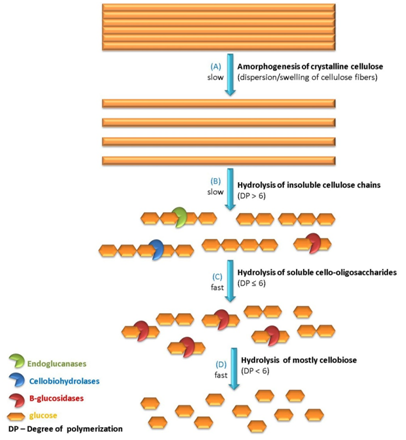 Cellulase represents the type of enzymes produced by fungi or bacteria that catalyzes the decomposition of cellulose-like polysaccharides. Three major types of enzymes are generally involved in hydrolyzing cellulose micro fibrils in plant cell wall: endo glucanase, exo glucanase and β-glucosidase. Endoglucanases, e.g., 1,4-β-D-glucan-4-glucanhydrolase could randomly attack the internal bonds at amorphous regions of cellulose while creating new chain ends that can be attacked by other types of enzymes. It is generally believed very active against soluble cellulose derivatives or acid-swollen amorphous cellulose.20 Exoglucanase, e.g., 1,4-β-D-glucan-cellobiohydrolases, generates glucose or cellobiose from the reducing or non-reducing end of cellulose polysaccharide chains. Unlike endoglucanase, exoglucanase is normally very active against crystalline cellulosic substrate such as Avicel or cello-oligosaccharides.18 Last but not least, β-glucosidase, e.g., β-glucoside-glucohydrolases, can hydrolyze cellobiose to glucose from the non-reducing ends and it is inactive against amorphous or crystalline cellulose. Figure 2 illustrates a proposed mechanism for cellulose de-polymerization by complex cellulase system. It is worth mentioning that fragmentation of cellulose aggregations into short fibers has been observed and reported during the beginning of cellulose hydrolysis prior to releasing any detectable amount of reducing sugars, known as amorphogenesis as shown in Figure 2(A).21