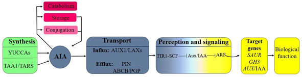 Figure 1 Auxin response network: The balance between auxin synthesis (green box), conjugation, storage and catabolism (rose boxes) controls the pool of IAA (blue disc). Cellular auxin content also depends on the auxin transporters (blue box). Binding of auxin to the SCFTIR1/AFB auxin receptor complexes, allows ubiquitination and degradation of the Aux/IAA protein, depressing activating ARF-regulated loci (yellow boxes).24