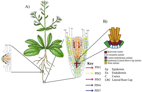 Figure 2 Auxin transport by the PINs carriers in Arabidopsis root: (A) At primary root tip the auxins are mobilized by PINs different, while only two members of PIN participates in root lateral development. (B) Schematic of Stem Cell Niche (SCN) of the primary root of Arabidopsis.27