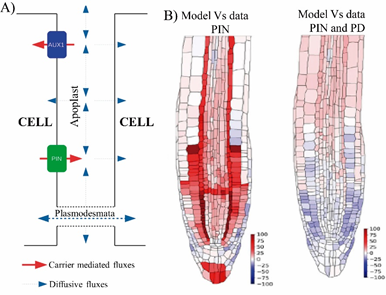 We can has observed in Figure 3A that auxins in addition to being mobilized through PAT, also it diffuses through plasmodesmata by the symplastic transport. It has been reported that the ST of auxin affects phototropism, lateral root emergence, and leaf hyponasty.23 Mellor, et al.,2 compared in vivo experimental data of Arabidopsis root auxin level with the level predicted by in silico experiments (Figure 3B). The results from both distributions showed very large discrepancies between auxin concentrations when only PAT was considered, unlike the high agreement when both PAT and ST were taken into account. This allowed the authors to recommend that in any process of plant development that involves the auxin transport, both types of movement must be considered.