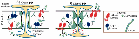Figure 4 Callose mediated plants open and close plasmodesmata: (A) A cartoon representing ‘open’ plasmodesmata (left). (B) ‘Closed’ plasmodesmata (right) due to over accumulation of callose in cell walls.38