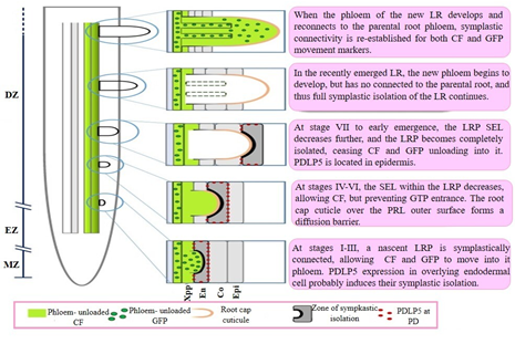 Abbreviations: CF, CarboxyFluorescein; Co, Cortex; DZ, Differentiation Zone; En, Endodermis; Epi, Epidermis; EZ, Elongation Zone; LR, Lateral Root; LRP, Lateral Root Primordium; MZ, Meristematic Zone; PD, PlasmoDesmata; PDLP5, PlasmoDesmata-Located Protein 5; SEL, Size Exclusion Limit; Xpp, Xylem pole pericycle.52