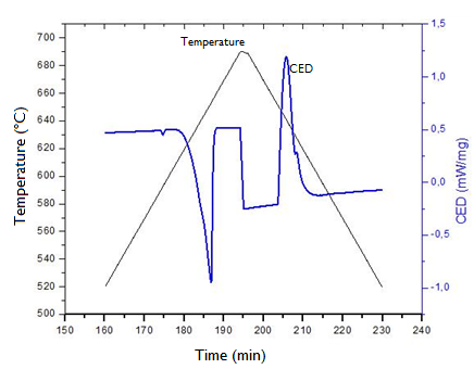 The possibility of processing semi-solid metal alloys depends on their suitability, that is, on the ability to control the relationship between the liquid and solid fractions of the thixotropic mixture, as well as the range of solidification of the alloy and the sensitivity of the liquid fraction with the temperature according Manonukul et al.5 In this work we used the differential exploratory calorimetry thermal analysis (CED), Figure 1, in which the black line represents the heating and cooling curve during the test, which was performed at a thermal variation rate of 5°C/min, and the blue curve represents the change in energy over time. The determination of the thermal parameters of the alloy is made from the energy flow curve by the temperature, finding the inflection points in the curves of their first and second order derivatives.