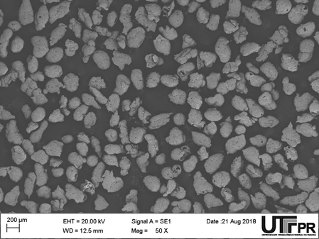 The ceramic micro-balloons used come from the coal combustion by-product, known as Fly Ash, because they have a hollow structure and a density between 0.6 and 0.8 g/cm³. They are ideal to be applied in the production of metallic foams syntactic. The balloons used in the work were separated by sieving and the different acquired portions were analyzed by scanning electron microscopy (SEM), Figure 2, for the quality and dimensions of the balloons as reported Orbulov.8 The 100 grit size was chosen because it presented better quality and size of the balloons, having average dimensions A (balloon length) and B (width) of 266.185 µm and 197.745µm, with a wall thickness of 2.5µm. obtained from a simple mean statistical analysis of the values measured by the SEM test.