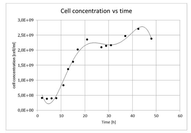 In the 8° hour, approximately, the exponential phase begins, it lasts 20 hours on average. It is worth mentioning that, owed to the saturation of the sensor, it is not possible to appreciate the moment of deceleration in which the graphic changes its concavity to initiate the stationary phase. From there on, the stationary phase begins, the concentration of gas falls drastically since the cells stop reproducing and diminish their metabolism.
