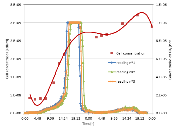Figure 2 shows the three experiments where the growth of the yeast was monitored, measuring the concentrations of carbon dioxide through time. The experiments lasted 50 hours, and the sensor took a sample of the concentration of carbon dioxide every 10 minutes. In all experiments, the sensor reached saturation point, ie it obtained a concentration of 1000000 PPM, or a concentration of 100% of CO2, which is the same, in the exit gases of the fermentor. It seems difficult to believe that such a concentration was accomplished with a lab reactor, knowing that the air never stopped being introduced to it. Taking into account Saucedo by Castañeda et al.,9 he also argues that the concentrations of CO2 are hard to find at higher percentages than 10% (that is 100000 PPM) in aerobic fermentations. The sensor’s point of saturation may be due to the gas sample coming from the sensing camera through a diffuse membrane. This method makes the sampling process slower than the concentration of CO2 when the production rate is at the maximum and very accelerated. In this way, the sampled gas does not leave entirely the sampling chamber when a new sample is measured. As a consequence, the concentration that the sensor reads is an accumulated concentration, and not the instantaneous one during that period.