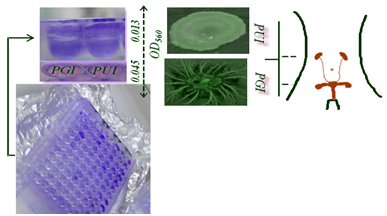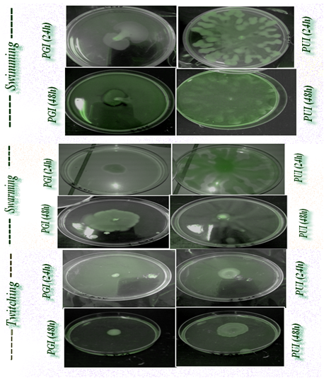Interestingly, the results of the present report revealed a significant diversity in biofilm formation within the clinical isolates with OD590 readings of 0,045 and 0,013 for the urinary and genital isolates, respectively (Figure 2). The urinary isolate exhibit swarming and twitching motility. Twitching motility was distinguished by the presence of an interstitial twitch zone formed by colony expansion. The urinary isolate exhibiting twitching motility formed flat spreading colonies with a characteristic “rough” appearance and a twitching zone consisting of a very thin layer of cells observed as a halo around the colony (PUI 48h). However for the genital isolate only a swimming motility was signaled. Nonetheless, it is notable that the di-rhamnolipids were released in the medium and in the case of swimming motility (PGI 48h). Chemotaxis test "self made" was positive for glucose, tryptophan and levodopa with distinct response. The quantitative assessment of chemotaxis toward levodopa revealed that enumerated CFUs of the genital isolate (PGI) was higher (29.102 CFUs.ML-1) than the urinary isolate (13.102 CFUs.ML-1) because of the evolved sensors for detecting eukaryotic hormones.