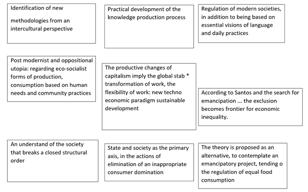 State and society: as the primary axis, in the actions of elimination of an inappropriate consumer domination. An understanding of society that breaks a closed structural order. According to Santos, and the search for emancipation; exclusion becomes a new frontier for economic inequality The theory is presented as an alternative, to contemplate an emancipatory project, tending to the regulation of equal consumption In this sense, making the reference in food production, to generate a improvement in the rise in cost benefit from production to consumption, it is necessary to recreate emancipatory mechanisms that are consistent with a systemic ordering of attention to the needs of the pillars of food sovereignty and food law. This will generate a true rationality of the measurement of food inequalities in social structures; Taking into account some important concepts, recognizing ourselves and seeing ourselves in a neoliberal model, it seems that this is the objective of the state, it is not to understand ourselves from the social point of view but from the economic point of view, if it were in the social sphere, all rights would be fulfilled, the state is the one that is going to promote the neoliberal system and not attending to questions of a social nature. First challenges as you will have with these problems that make us reflect, leave all this to change and organize ourselves in a different way. The identification of methodological strategies from an intercultural perspective, practical development of the production process of knowledge, regulation of modern society as well as being based on essential ideological visions and daily practices. Through the search for mancipation, exclusion becomes a new frontier for economic inequality. Until reaching the utopia presented as a precaution against the possibility that an emancipatory project tends to regulation, producing new equality.