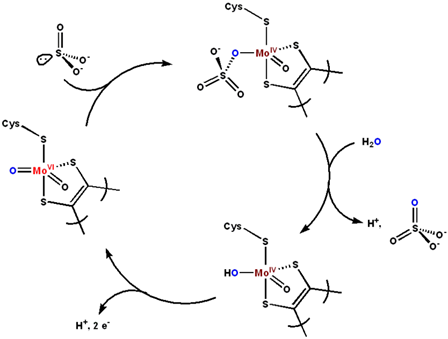 The active site of SOx contains the molybdopterin cofactor and supports molybdenum in its highest oxidation state, +6 (MoVI). In the enzyme's oxidized state, molybdenum is coordinated by a cysteine thiolate, the dithiolene group of molybdopterin, and two terminal oxygen atoms. Upon reacting with sulfite, one oxygen atom is transferred to sulfite to produce sulfate and the molybdenum center is reduced by two electrons to MoIV. Water then displaces sulfate and the removal of two protons (H+) and two electrons returns the active site to its original state. A key feature of this oxygen atom transfer in enzyme is that the oxygen atom being transferred arises from water, not from dioxygen (O2) (Figure 2).