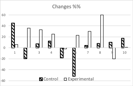 The rhythmogram was recorded at rest and evaluated by 5-minute recording in rest. Dynamics of median parameters of HRV in two groups is presented in Table 2 & Figure 1. As it follows from the data, the experimental group was characterized by the growth of parameters reflecting parasympathetic activity and variability of heart rhythm and the decrease of parameters which reflect the degree of sympathetic regulation and centralization of heart rhythm. Significant changes were noted in most of the indexes after two weeks of listening to Quantum Resonance Technology apps (Yippi Wave 3.0) program, which indicated growth of the economy of respiratory and cardiovascular systems functioning, growth of the adaptive and energetic potential of the organism, as well as a recovery potential. Statistically significant changes were detected on the Stress-index, which correlates with the results of psychological testing. In the control group, inverse changes in HRV were noted, indicating increased activity of the sympathoadrenal system, which reflected the centralization of the heart rhythm, reduction in the adaptation potential of the organism and its reserve capacity. Perhaps, this is due to the time of the experiment: the end of the year, which is why summing up, submitting reports and a high level of tension of both the psycho-emotional and the regulatory activity.