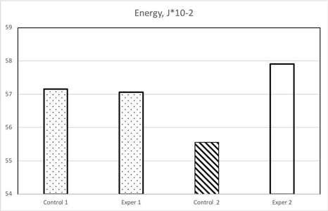 The results are presented in Table 3 &Figure 2. As we can see from the graphs, in the initial measurement between control and experimental groups there was no difference, but 2 weeks later Energy dropped down in the control group and Stress dropped as well. In the experimental group, Energy increased and Stress decreased more than in the control group. There was no statistical difference between 1st and 2nd tests for both groups, but if we removed 2 people from calculations, Energy increase in the experimental group would be statistically significant.For the participants of the control group listening to classic music Stress level dropped down and Energy decreased. Figure Comparison of averaged Bio-Well data for the initial measurement (1) and after 2 weeks (2) for the control and experimental groups for Stress coefficient.