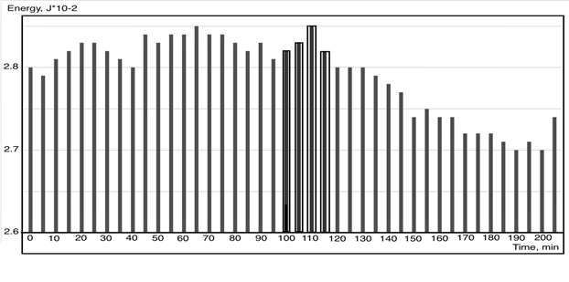 8 experiments were conducted and in all the Energy of photons measured in Bio-Well software decreased after playing music. Results are presented in Table 1, example of data processing presented at Figure 3. Playing Handel music had no effect on the device parameters.