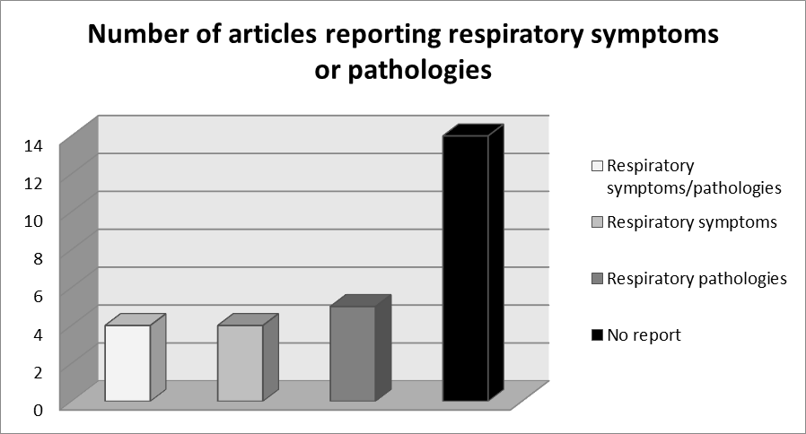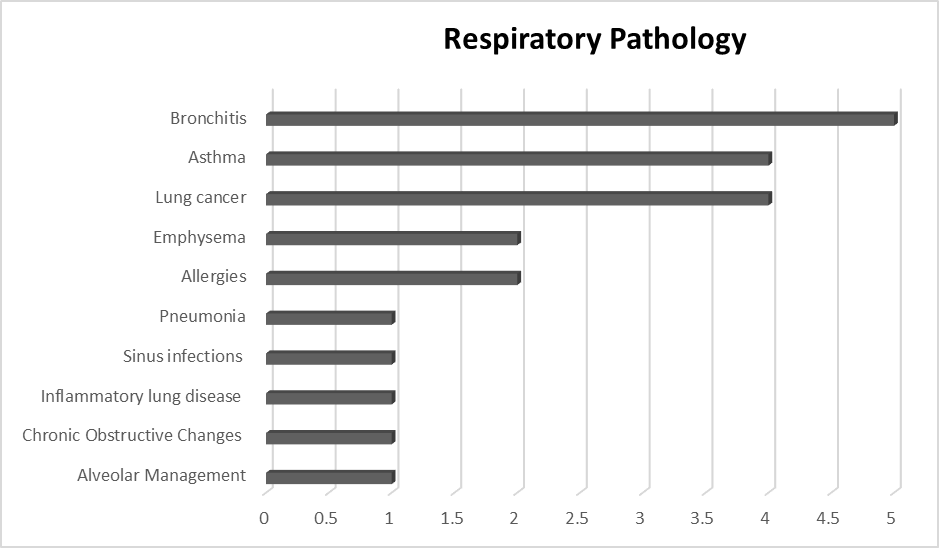 The included studies are numbered in Graph 1, published between 2015 and 2020, mainly in South America, Latin America, and Europe. There were 8 studies related to the components of surgical smoke and respiratory symptoms and / or pathologies (Graph 2) of which three were systematic review studies, one qualitative study, one descriptive study, one literature review study, and two did not report the type of study.