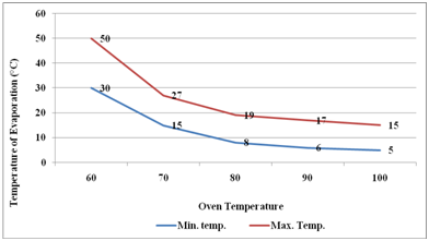 The results showed that all the essential oils at 60°C, 70°C, 80°C, 90°C and 100°C levels of temperatures evaporated from filter paper without remaining of any greasy “spot” this indicate that there is no adulteration of essential oil with fixed oil and it is a pure essential oil. Also the results of the minimum and maximum time for evaporation of essential oil; for the 6 essential oils; from filter paper under different temperature levels of air-forced oven has been illustrated in Figure 1. The results showed that the evaporation rate was increased with an increase of temperature from 60°C to 100°C. The minimum time for evaporation at 60°C was noticed in 30 minute and maximum time of the evaporation was 50 minute. The minimum time of evaporation at 70°C was noticed in 15 minute and the maximum time was 27 minute. The minimum time of evaporation at 80°C was noticed in 8 minute and the maximum time was 19 minute. The minimum time of evaporation at 90°C was noticed in 6 minute and the maximum time was17 minute. Minimum time for evaporation at 100°C was 5 minute and the maximum time was 15 minute. These findings postulated that the time for evaporation of essential oil from filter paper is inversely affect by air-force oven temperature; and this agree with Salim who found that oil content of spearmint essential oil decreased with an increase in oven temperature.17 Nevertheless, essential oil composition and quality are greatly influenced by oven drying temperature and about 75.7% of essential oils are lost during oven drying at 60°C than at 30°C.18