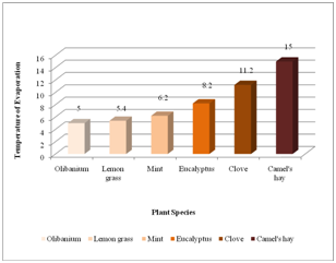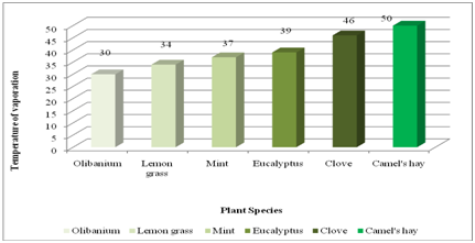 Evaporation of different essential oils at 60°C illustrated in Figure 3. It explained the maximum volatilization temperature of different essential oils. The minimum time of evaporation at 60°C was noticed in 30 minute for Olibanium, Lemon grass 34°C, Mint 37°C, Eucalyptus 39°C, Clove 46°C and maximum time was in 50 minute for Camel’s hay. The different volatility of essential oil in different species was due to the differences in the oil components. The volatility of essential oil compounds agree with Bartly et al.5 who mentioned that the essential oil constituents can be adversely affected during drying of herbs5 and also with Diaz-Marotom et al.21 found that the drying method had an effect on the volatile compounds.5 Deans and Svoboda mentioned that loss of essential oil is unavoidable during drying processes.22,23 This postulation agrees with Paul Boizot24 who stated that essential oils evaporate at different rates. Aromatherapy has borrowed the perfumer's terminology and describes oils that evaporate quickly as "top notes", those that evaporate slowly as "base notes" and those in-between as "middle notes". This is not the same as whether oil has a strong or weak odour, though the two things can be confused, as oil that evaporates quickly will have a greater immediate impact on your sense of smell. Lemongrass is, peppermint is TOP TO MIDDLE and clove is BASE.