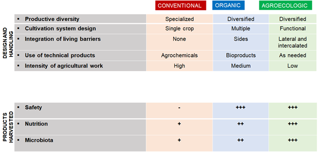 As a relative synthesis, the main differential characteristics in the design and management of cultivation systems based on conventional, organic and agroecological transition, which considers productive diversity, the design of cultivation systems, the integration of living barriers and other auxiliary vegetation structures, the use of technical products for crop nutrition and health and the intensity of work on the soil and cultivation, allows us to visualize their contribution to the safety, nutritional value and microbiota of the harvested products (Figure 1).