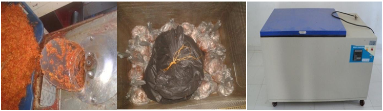 Fresh tomato pomace having 80-85% moisture content (w.b.) was procured in bulk from a nearby Tomato processing industry, M/s Nirmal Foods Pvt Ltd, Ta: Virsad (Anand), Gujarat. The pomace was bagged and stored at -20°C in deep freezer (Figure 1) until used for further analysis and experiments. The pomace sample was drowned from deep freezer and then allowed to thaw for 120min before analysis and experiments. The extraction of lycopene from tomato pomace using Shaker water bath was carried out by placing 5g (approx.) weighed sample into iodine flask containing 150ml of solvent system and then placing it on the flask rack of shaker water bath maintained at required temperature-time combination. The extract was then analyzed for its lycopene content using UV-Vis spectroscopy technique (Make: Varian-Carry-50). The remaining extract, was taken for measuring the lycopene content using UV-Vis spectrophotometer at 503 nm.11-13 The data were recorded and the lycopene content (mg/100 g) was calculated using the following formula: