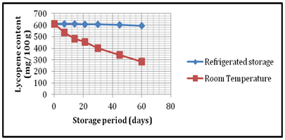 Storage Study of the lycopene extract: The storage study was carried out for 60 days and samples were analyzed for its lycopene content (mg/100g) at 6 intervals and the values are reported in Table 4. The trend of lycopene content during the storage period at two different conditions is depicted graphically in Figure 2. From the Figure 2, it indicates that as the storage period increased, the lycopene content decreased for both the conditions of storage. The lycopene content decreased quite faster at 30°C storage as compared to at -4°C temperature for a particular period of storage. The lycopene content almost remained same for the entire period of storage at -4°C. The effects of temperature and time of storage were significant at 5 % level. The storage study results were in accordance with those reported by Akbari, et al.14 The maximum lycopene content was obtained when the extract was fresh while the minimum lycopene content was obtained at the end of the storage of 60 days at 30°C. This may due to the degradation of trans-lycopene in to cis-lycopene (isomerization). Light and heat disintegrate tomato tissue and can result in destruction of lycopene. From the results, it was observed that the storage of lycopene at -4°C can retain maximum lycopene quality.