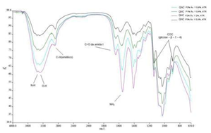 Analysing the spectra of the infrared nanocrystalline chitosan region (QNC), it was observed the similarity to with chitosan acetate (AQ), varying only the intensities of the bands that are proportional to polymer concentration. This confirms that after the aggregation method macromolecule structure glucosamine and purification process shown in (Figure 2), nanocrystalline chitosan shown with the main precursor of chitosan identifying peaks as illustrated in (Figure 4).