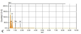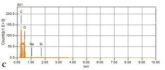 Regarding traits in percentage by mass of the sample in study 1:0.4 for the silicon and sodium, silicon remained without a significant increase, unlike the sodium concentration increased significantly attributed to the agglomeration process of macromolecule glucosamine using sodium hydroxide. The purification process for removal of residual sodium acetate was not effective, being necessary to wash longer and with a greater amount of distilled water. Carbon, Nitrogen and Oxygen confirm the organic and structural character of the polysaccharide confirmed by FTIR item 3.1.