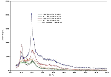 The use of X-ray diffraction also allows distinguishing clearly the starting precursor chitosan (QP), chitosan acetate (AQ) and its derivative chitosan the nanocrystalline (QNC). The diffract gram of commercial chitosan sample showed more intense and/or better peak, defined as that observed in the XRD patterns of chitosan after the reactions with acid and neutralization with sodium hydroxide (Figure 7), which is attributed to the existence of crystalline domains larger and more in the case of commercial chitosan. According Samuels,22 the peaks at 10° and 20° are characteristic of crystallinity of the chitosan membrane. Samples AQ 1:0.4 (broader band) have much less intense signals and are typical of amorphous chitosan due to the dissolution of the macromolecule of glucosamine by acetic acid. The lack of land to be attributed to the presence of positive charges (due to protonation of the amino groups) in the chain of samples and their respective counter ions (Figure 7), however the QNC samples show that they are similar in crystallinity. Suggesting a reduction of the crystal size, consequently the crystalline region and the amorphous region increases significantly, resulting in a structural change of the leaving polysaccharide polymer more reactive and less structural characteristics.