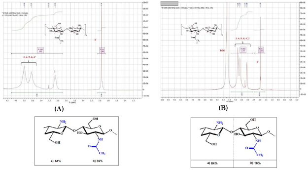 The degree of deacetylation (GD) is considered one of the main parameters in the characterization of chitosan. It is defined as the number of free amine groups to the number of groups of the polymer chain. The assignment of the signal observed in the spectra of Figure 8 correspond to the signals, between 3 and 4 ppm of the hydrogens attached to carbons 2-6 and glycosaminoglycans ring. The singlet at 1.96 ppm region corresponds to the hydrogen from the methyl acetamido group. The reduction of AQ GD 1: 0.4 refers to the dissolution of the macromolecule of glucosamine with addition of acetic acid, favouring the creation of new acetyl groups, as shown in (Figure 8A). The increased GD QNC 1:0.4 recrystallization is related to the glucosamine molecule with addition of sodium hydroxide, favouring the creation of new amino groups, due to sodium ions bind more easily to the acetyl group, freeing again free amine groups as shown in (Figure 8B). The GD AQ and QNC determined from the 1 H NMR spectrum of chitosan was 64 and 84%, respectively. That is, 64% of the monomers of the AQ are deacetylated and 36% are acetylated (Figure 3). In QNC, only 16% of the monomers were acetylated.