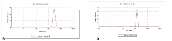 The value of the zeta potential of the AQ 2:0.8 in acid medium (pH 4.43) was 43.6 mV. While the value of QNC 2:2 (pH 7.3) was 15.4 mV. Thus, the behavior of nanocrystalline chitosan did not become stable due to the high polydispersity. The variation of the particle size of the samples AQ 2:0.8 and QNC 2:2 using 0.450 uM mesh filter, indicated the average particle size of 55.52 and 266.0 nm, respectively.