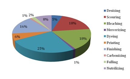 Water pollution has been a threat to living beings. The major contributors of water pollution are industries mainly dye, dairy, food, etc, Dye industry tops the chart by releasing 2-20% of its effluent in environmental components.1 Due to the ease and cost-effectiveness in synthesis, firmness, stability to light, temperature and microbial attack, the usage of synthetic dye have been increased in the textile and dyeing industries.1 10-25% of the total world production of dyes is lost during dyeing process like desizing, scouring, bleaching, mercerizing and dyeing process.2 Figure 1 shows the pie chart of the water consumption in wet processing steps. Water usage in such processes can generate millions of gallons dye wastewater every day. The redundant usage of water significantly increases the discharge of dye effluent and thereby contaminate freshwater.