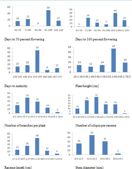 Figure 1a Frequency distrubution for quantitative agro-morphological characters in 104 germplasm accessions and check variety of rapeseed and mustard.