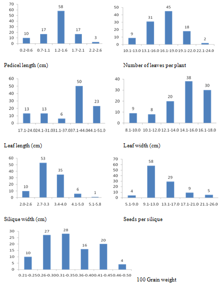 Figure 1b Frequency distrubution for quantitative agro-morphological characters in 104 germplasm accessions and check variety of rapeseed and mustard.